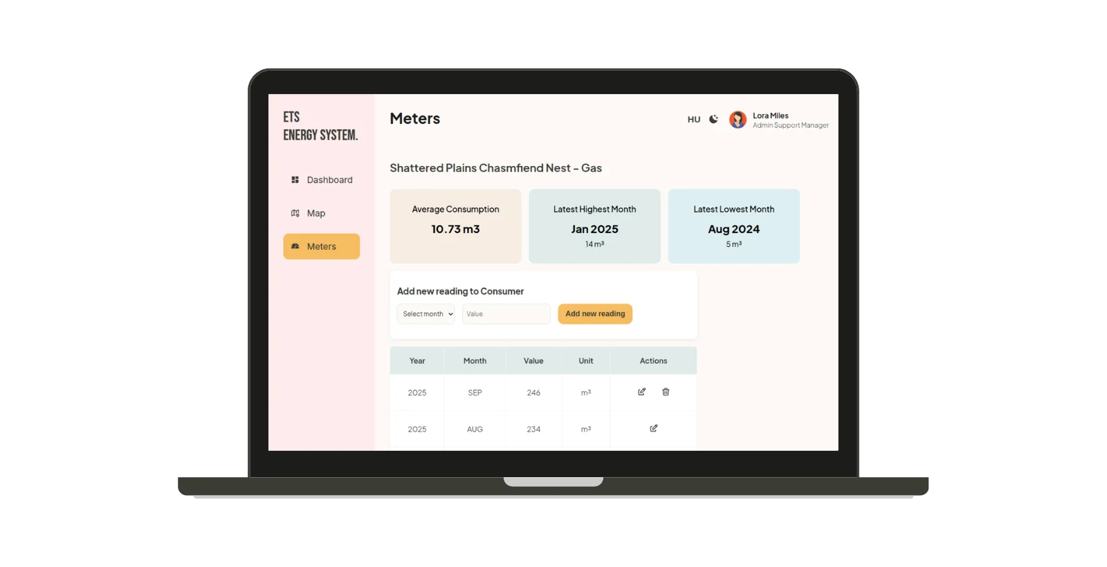 Modern, reszponzív admin felületet fejlesztettem asztali használatra, amely gáz- és villamosenergia-fogyasztási adatokat jelenít meg és kezel. A projekt egy egyedi, felhasználóbarát UI-ra épül, interaktív táblázatokkal (szűrés, rendezés, részletek), Leaflet-alapú térképes nézettel, valamint Recharts segítségével készült halmozott oszlopdiagramokkal. Tartalmaz CRUD funkciókat, JavaScript-alapú számításokat, világos/sötét módot, többnyelvűséget (EN/HU) és unit teszteket.